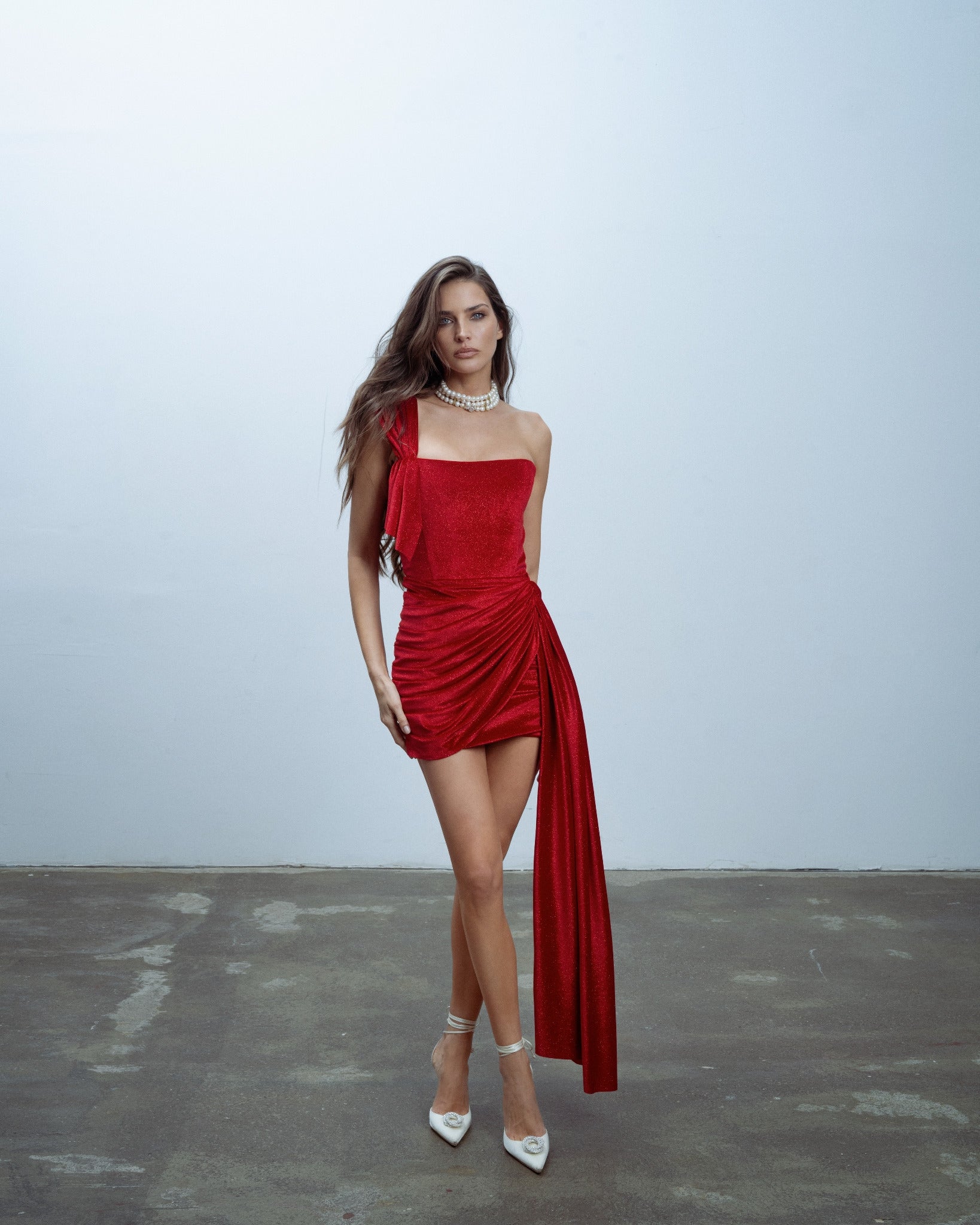 A striking red velvet mini with a straight-cut corset, featuring a draped strap across one shoulder. The ribbon gently unfolds from the waist, sweeping gracefully to the legs with a slightly more playful energy than its black counterpart. The vibrant tone amplifies warmth and confidence, making this mini a bold statement.